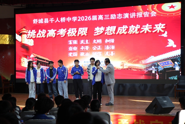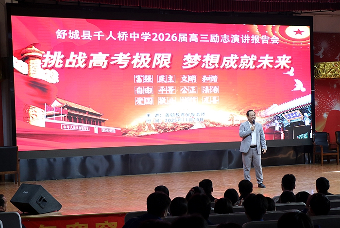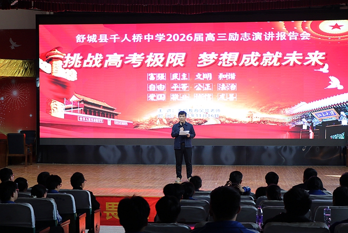 11月16日下午,千人桥中学全体高三师生齐聚校报告厅,一场主题为“挑战高考极限,梦想成就未来”的励志报告会燃情开讲。活动旨在激发学子斗志,为高考冲刺注入动能,氛围热烈高涨。报告会由副校长黄金星主持,特邀善朝教育吴畏老师主讲。