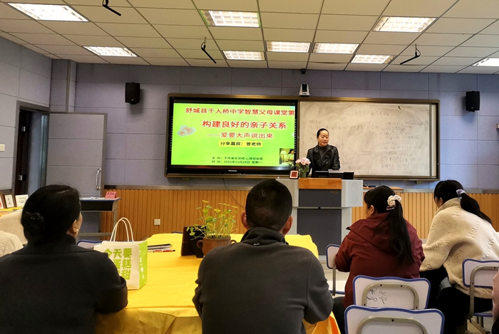 11月24日,千人桥中学家长学校心理咨询室主办的“智慧父母课堂”第六期开课,以“构建良好亲子关系——爱要大声说出来”为主题授课。