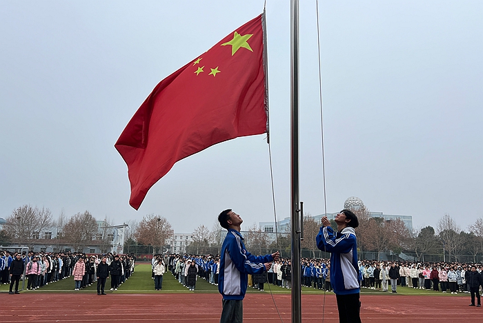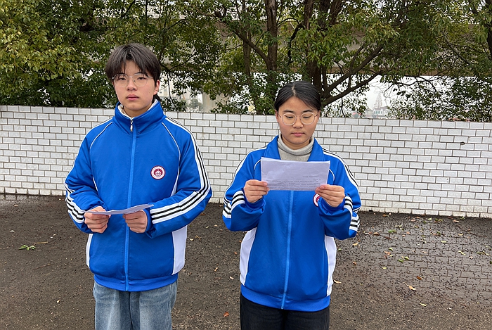 激昂的《义勇军进行曲》奏响,五星红旗冉冉升起,全体师生肃立行注目礼,以庄重姿态表达对祖国的热爱与敬意。随后,高二(19)班刁文君同学作题为《新年新征程 拼搏正当时》的演讲,她以“时光流转,万象更新”开篇,号召同学们将2026年定为“奋进之年”,倡议大家从课堂专注、自习勤勉、晨读奋进、深夜坚持等细节做起,结合身边事例勉励大家摒除浮躁、凝聚力量,以恒心筑梦、以实干前行。