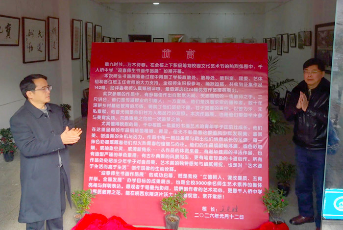1月12日,千人桥中学“迎新春”师生书画作品展盛大启幕。此次展览集中呈现硬笔书法、毛笔书法、绘画等多元类型作品,全面彰显全校师生的文化素养与精神风貌,为书香氤氲的校园增添了浓厚的新春艺术氛围。