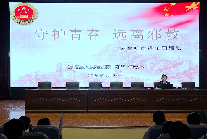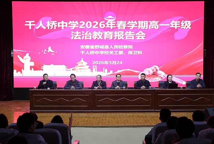 为提升青少年法治观念,增强反邪防邪意识和自我保护能力,3月24日下午第四节课,千人桥中学在报告厅开展法制教育进校园专题活动。舒城县人民检察院专委陈华、第一检察部副主任陈婷婷莅临指导,校长王克胜等校领导出席,活动由校保卫科科长林世玉主持,高一全体师生参加。